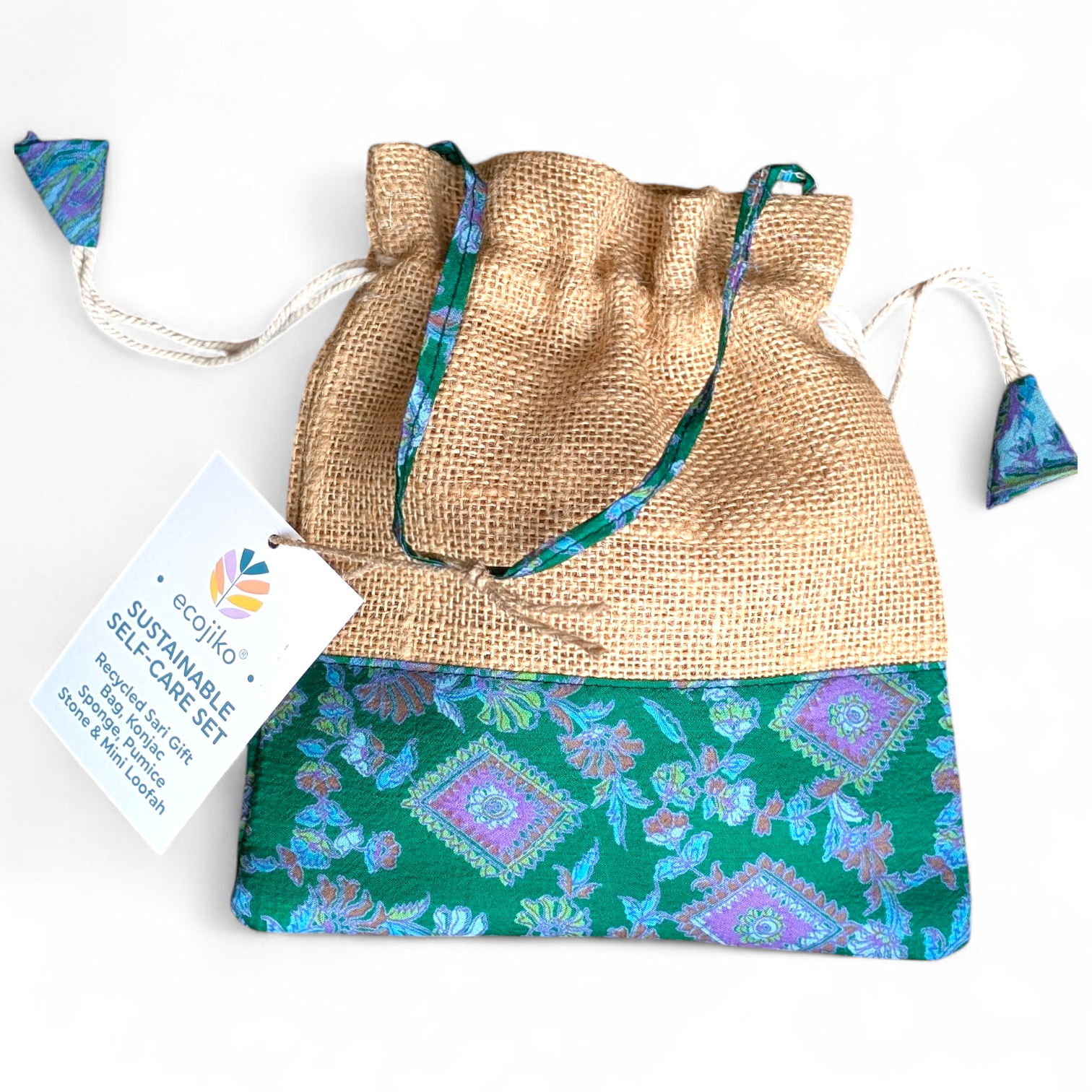 - Jute & recycled sari gift bag, pumice stone, konjac sponge, and mini loofah